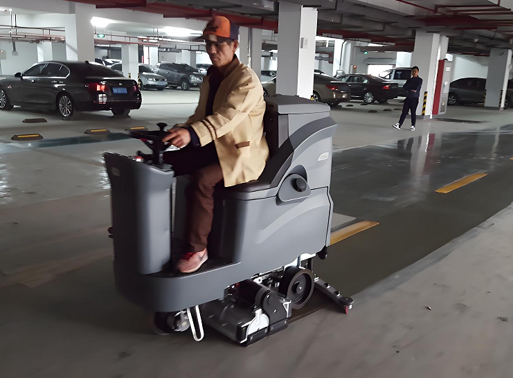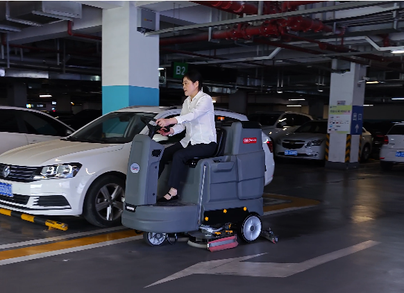 驾驶式洗地机:适用于商场的大面积环氧地面清洗,清洁效率高,驾驶式操作灵活,方便进出狭窄车位,爬坡力强,可以轻松经过减速带和出入口。