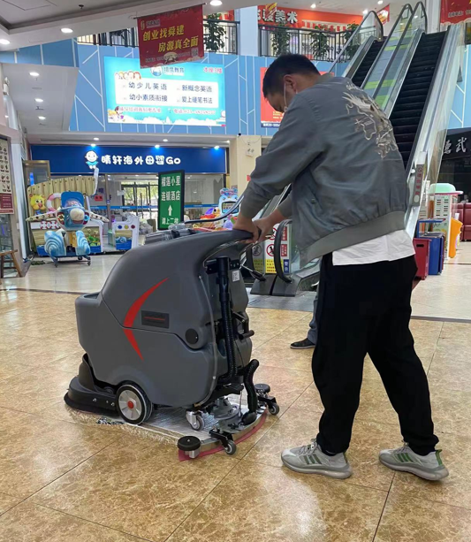 手推式洗地机:体积小、灵活轻便,适用于清洁狭窄处和角落区域的地面,如各楼层的购物区、通道等。工作人员只需控制清洁方向和速度,适合节假日人流拥挤时使用。