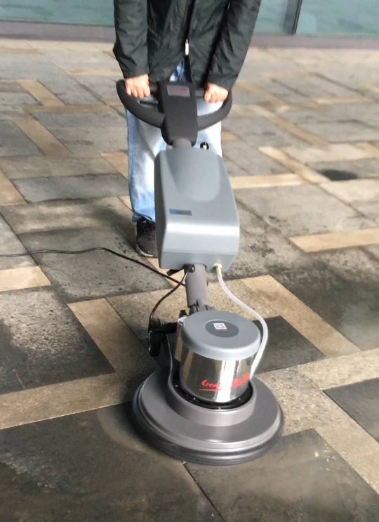 内场:大理石或瓷砖地面,要避免使用硬质刷子或工具刮擦,以免损坏地面光泽。日常可以用洗地机搭配百洁垫的组合清洗,污染较重可以搭配盘刷。另需定期进行打蜡保养,保持光亮。