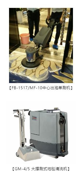 地毯清洗机:深度清洁、快速干燥,确保地毯可立即投入使用,可选不同机型,进行地毯中期保养或者彻底清洗。(中期清洗: FB-1517/MF-10中心出泡单刷机/泡箱;翻新清洗:GM-4/5 大摆刷式地毯清洗机)